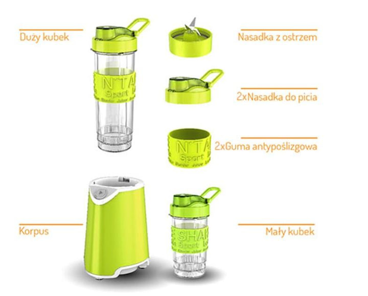 Компактні пляшки мають 2 силіконові кришки з мундштуком, що забезпечує зручне використання. Крім того, теплові екрани захищають від ошпарювання та захищають вміст від випадкового розливання. Пристрій має функцію подрібнення льоду, а його 4-ножеве лезо виготовлене з нержавіючої сталі, що забезпечує ефективне змішування та подрібнення інгредієнтів.